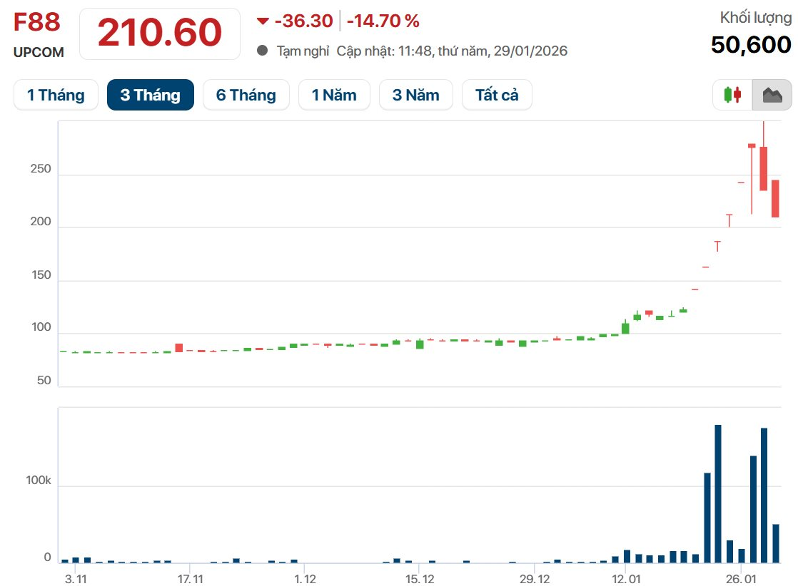 Nhưng trong phiên 28/1, cổ phiếu F88 đã giảm 14,01% và phiên sáng 29/1, giảm 14,7%, giảm gần 24% chỉ sau 2 phiên giao dịch. Vốn hóa doanh nghiệp giảm hơn 7.200 tỷ đồng.