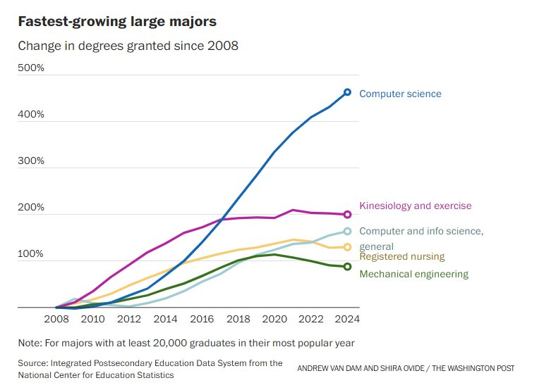 Theo dữ liệu từ Trung tâm Thống kê Giáo dục Quốc gia Mỹ (NCES), từ năm 2008 đến 2024, số lượng bằng cử nhân Khoa học máy tính (CS) được cấp đã tăng gấp 5 lần, vượt xa tốc độ tăng trưởng của bất kỳ ngành lớn nào khác như điều dưỡng hay kỹ thuật cơ khí.