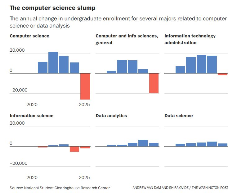 Theo Washington Post, số liệu cho thấy trong số khoảng 54.000 sinh viên "mất tích" khỏi ngành CS, có tới 35.000 người thực tế đã chuyển sang các ngành giao thoa mới. Các ngành như Phân tích dữ liệu (Data Analytics) và Khoa học dữ liệu (Data Science) đang chứng kiến sự bùng nổ, tăng từ mức vài trăm sinh viên năm 2020 lên hàng chục nghìn người vào năm 2025.