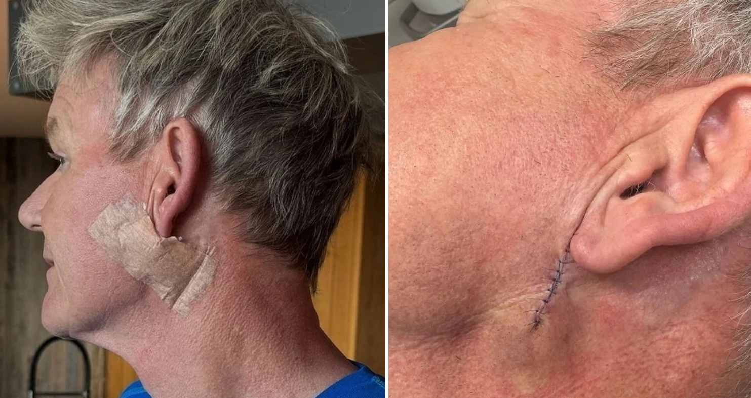 Ramsay đăng tải bức ảnh với băng gạc che một phần mặt và cổ, kèm tấm hình khác hé lộ vết khâu dài từ tai xuống cổ. Ông viết: "Biết ơn và trân trọng đội ngũ y tế tuyệt vời tại The Skin Associates vì đã nhanh chóng loại bỏ khối u biểu mô tế bào đáy này. Xin cảm ơn. Và xin đừng quên bôi kem chống nắng cuối tuần này".