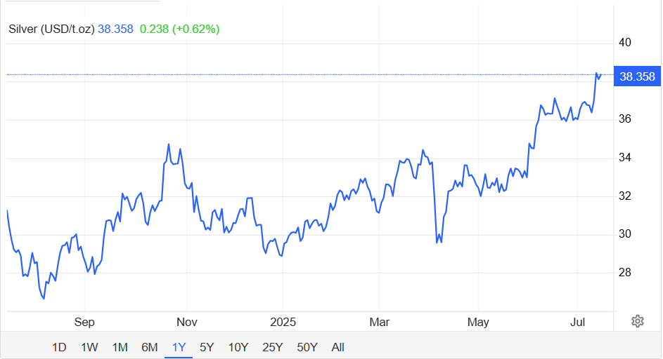 Trong phiên giao dịch mới nhất, giá bạc giao ngay tăng lên còn 38,358 USD/ounce, tăng 0,62% so với phiên trước. Nhà phân tích Nick Cawley từ Solomon Global cho rằng xu hướng tăng vẫn còn giữ vững nhờ nhiều yếu tố hỗ trợ vững chắc.