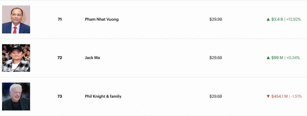 Với khối tài sản 30 tỷ USD, tỷ phú Phạm Nhật Vượng hiện đứng thứ 71 trong bảng xếp hạng những người giàu nhất thế giới, vượt qua cả những tên tuổi đình đám như Jack Ma, Chủ tịch Samsung Lee Jae Yong, Phil Knight và gia đình (nhà sáng lập hãng Nike), Tổng thống Mỹ Donald Trump và nhiều tỷ phú USD khác. Đây là kỷ lục mà chưa có người Việt Nam nào từng làm được trước đó.