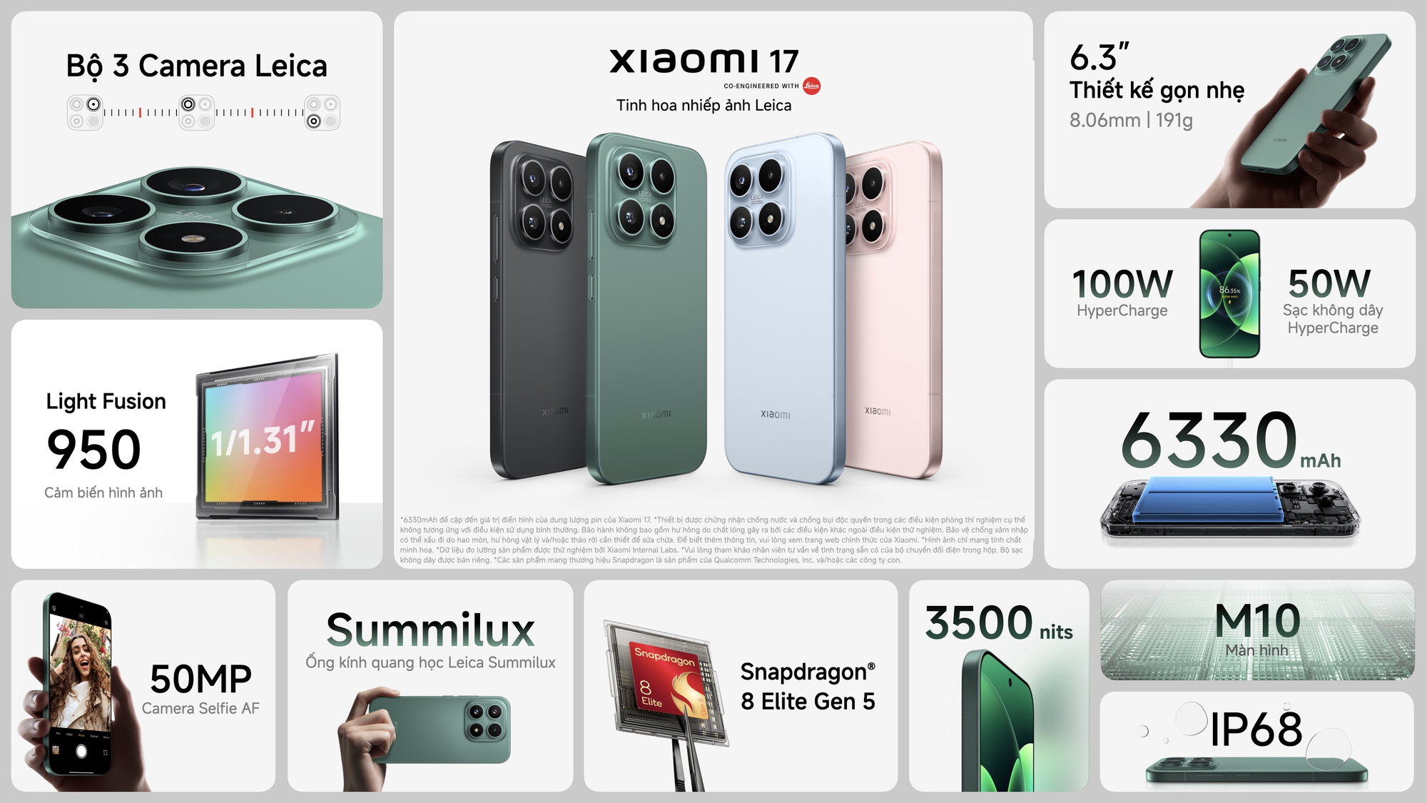 Phiên bản Xiaomi 17 có kích thước gọn hơn, trọng lượng khoảng 191g. Máy trang bị hệ thống ba camera Leica, trong đó camera chính sử dụng ống kính Summilux khẩu độ f/1.67 kết hợp cảm biến Light Fusion 950. Cấu hình này hướng đến cải thiện khả năng thu sáng và cân bằng vùng sáng – tối khi chụp đêm.