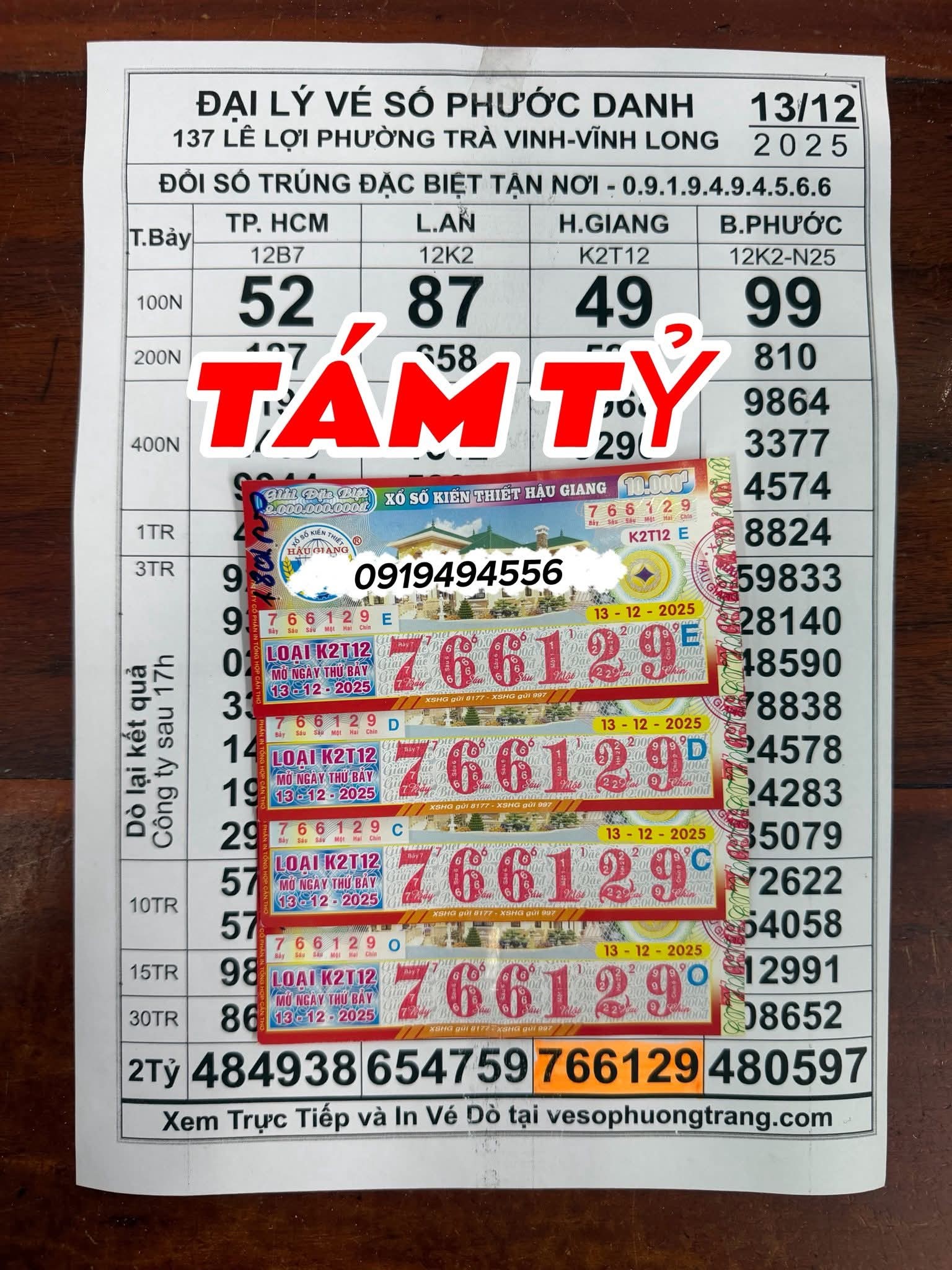 Theo đó, vào ngày 13-12, giải độc đắc (dãy số 766129) của vé số Hậu Giang, do Công ty TNHH Một thành viên Xổ số kiến thiết Hậu Giang mở thưởng chiều cùng ngày, đã trúng tại phường Trà Vinh, tỉnh Vĩnh Long. Nơi đổi thưởng là đại lý vé số Phước Danh ở phường Trà Vinh.