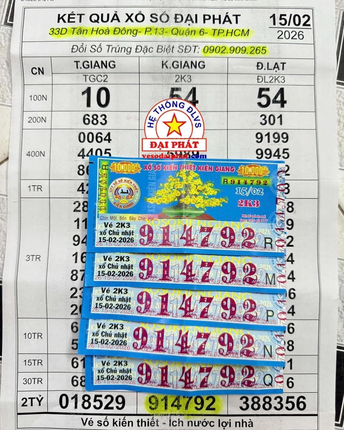 Mở thưởng cùng ngày với vé số Tiền Giang, giải độc đắc (dãy số 914792) của vé số Kiên Giang cũng được xác định trúng ở TPHCM.