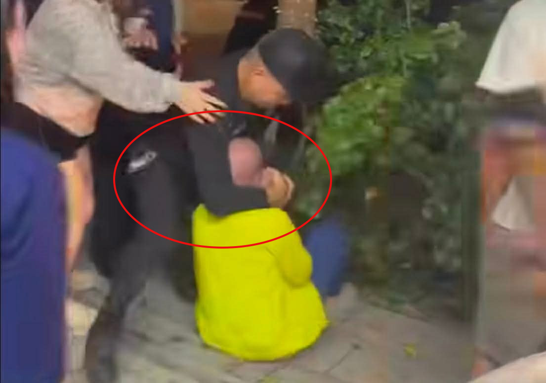 Người đàn ông mặc áo vàng bị nhóm người mặc áo bảo vệ quây đánh. (Ảnh: Cắt từ clip)