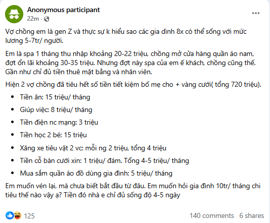 “Với mức sống thế này thì kể cả thu nhập không giảm, thì 1 tháng cũng không dư được bao nhiêu nên mình nghĩ mức sống của nhà bạn đang cao so với mức thu nhập. Phải bán vàng cưới, rút tiết kiệm tiêu thì tình hình cũng căng thẳng nếu không siết chặt chi tiêu. Giờ là bắt buộc phải giảm chứ không phải là giảm được thì tốt, không cũng không sao đâu” - Một người bày tỏ.