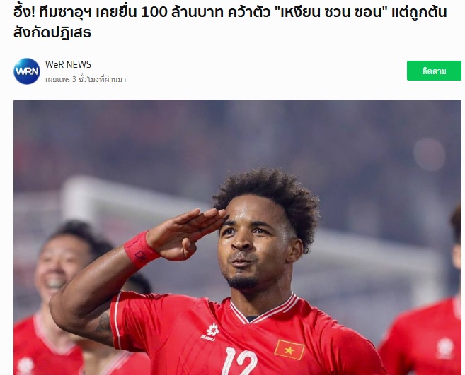 Cụ thể, trang Today.line.me của Thái Lan ngày 7/2 đã đăng bài viết có tiêu đề: “Thật đáng kinh ngạc! Đội bóng Saudi Arabia từng trả 100 triệu baht để có được Nguyễn Xuân Son nhưng bị từ chối”. Trang tin xứ Chùa Vàng đưa tin về việc một đội bóng của Saudi Arabia bất thành trước mục tiêu chiêu mộ Xuân Son hồi năm ngoái, dù sẵn sàng chi số tiền lớn.