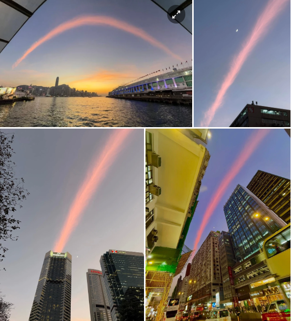 Khi đám cháy chung cư ở Hong Kong (Trung Quốc) vẫn còn lan theo hệ thống giàn giáo tre, nhiều người dân sinh sống ở các khu vực lân cận chụp được hình ảnh một dải mây màu hồng kéo dài kỳ lạ.