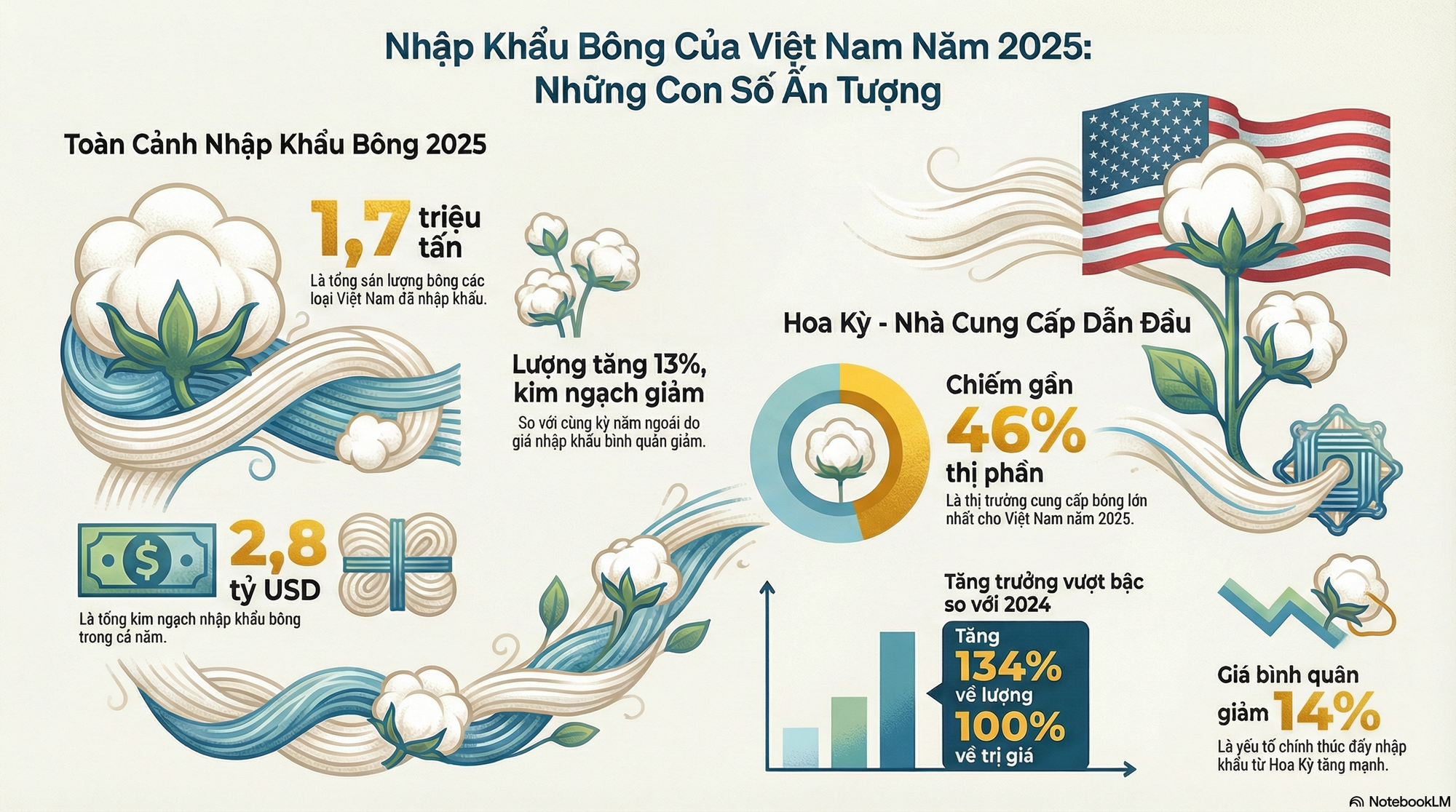 Tính chung cả năm 2025, nước ta đã nhập khẩu hơn 1,7 triệu tấn bông các loại, trị giá hơn 2,8 tỷ USD. Nhờ giá nhập khẩu giảm mà sản lượng tăng hơn 13% về lượng nhưng giảm kim ngạch so với cùng kỳ năm ngoái.
