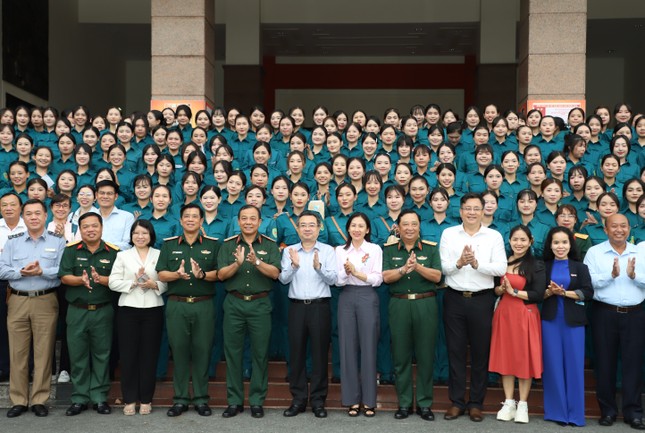 Lãnh đạo TPHCM chụp ảnh lưu niệm cùng đội hình nữ dân quân tham gia diễu binh, diễu hành trong lễ kỷ niệm trọng đại của đất nước.
